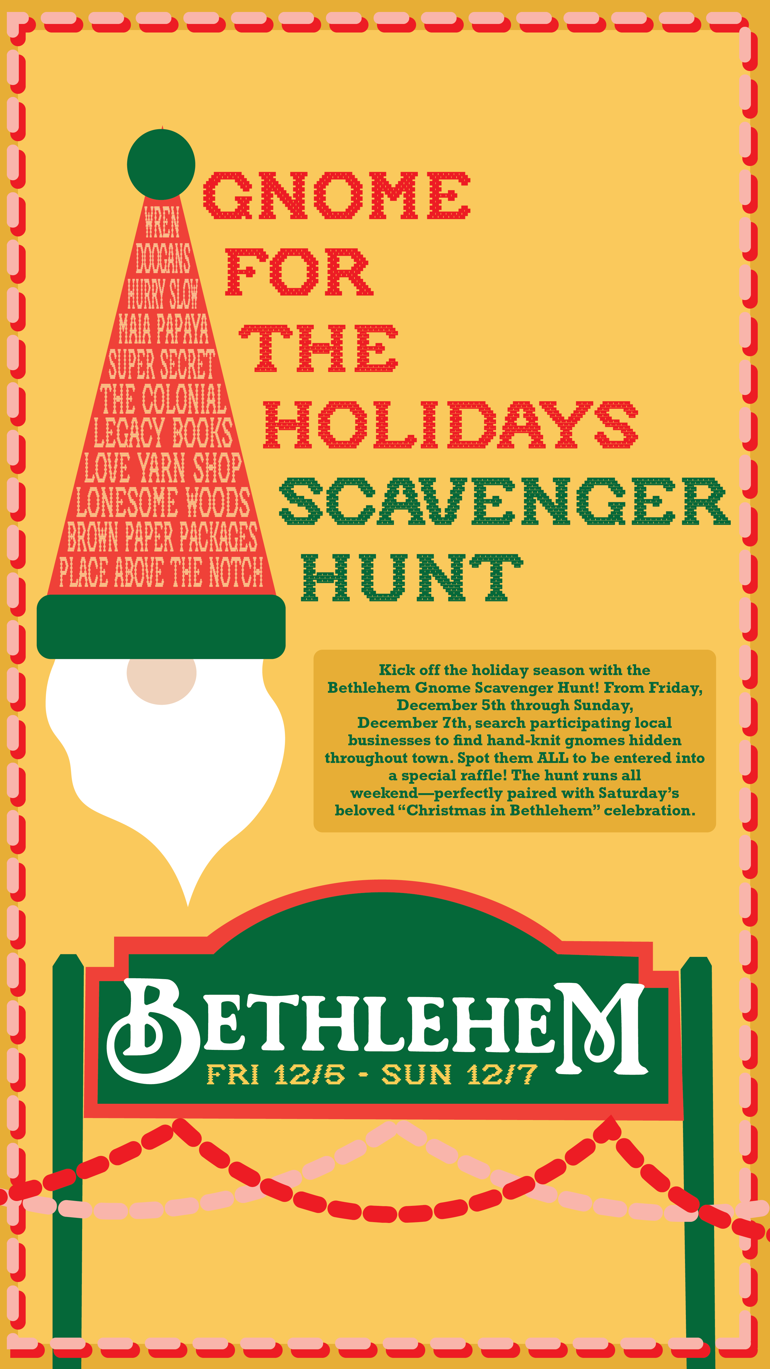 Join us December 5th, 6th, and 7th for Christmas in Bethlehem! We’ll be having a Gnome Scavenger Hunt with participating businesses–thank you Casey Kristoff for loaning us your collection! Friday night, participating shops are open until 8:00 for Light Up Bethlehem, with sales and goodies. Love.Yarn.Shop. will be making Christmas cards with you on Saturday afternoon and you can make us a stop in your fun-filled afternoon and evening. Make Bethlehem your destination this holiday season!