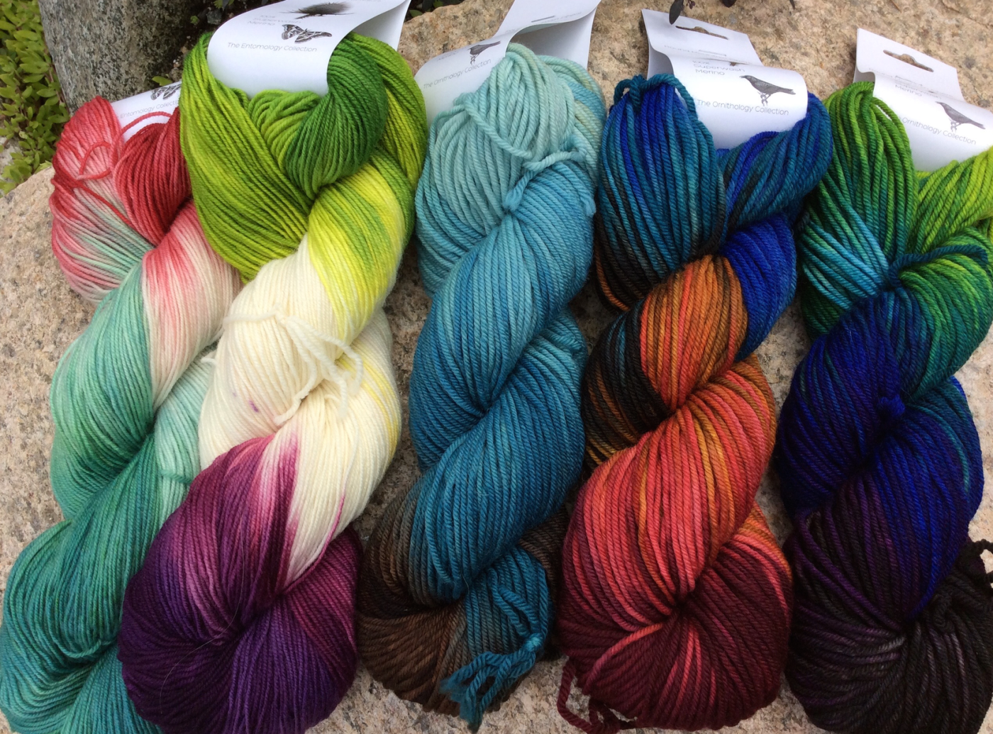 That’s the phrase that comes to mind when I am unpacking new color ways from Round Mountain Fibers: Luna Moth, Hubbard’s Caterpillar, Robin’s Nest, Mandarin Duck and Bufflehead. The dyer, Monica MacNeille, captures the colors of the birds and butterflies beautifully. There are many fine dyers, but Monica has an incomparable eye. Come see her yarns first hand.