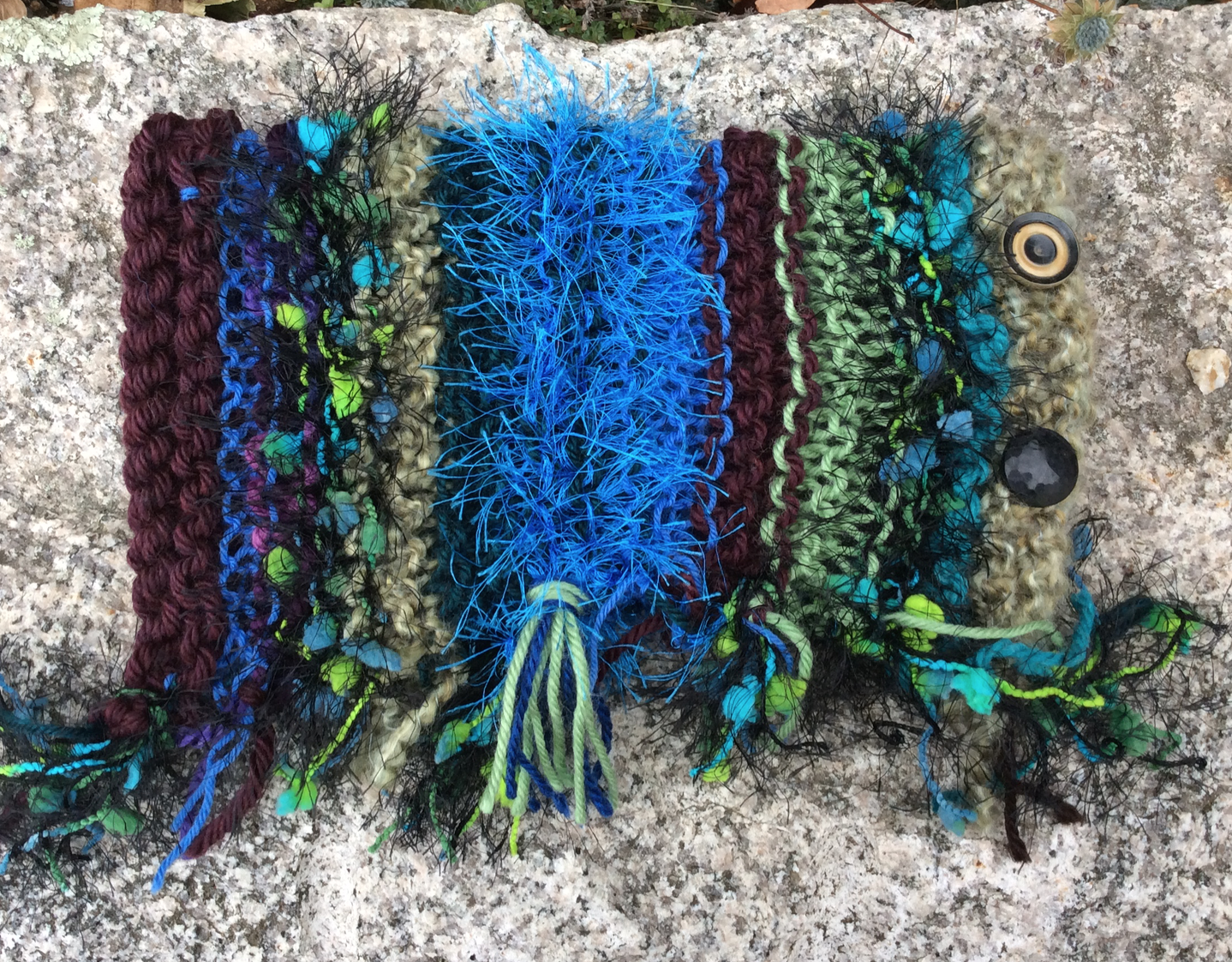 Switch to another yarn every 3 rows, leaving yarn ends with four inches to make fringe.