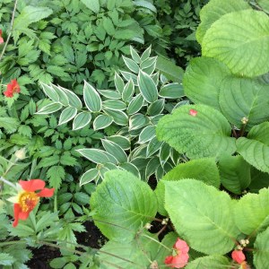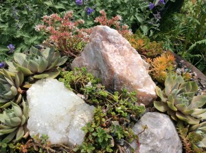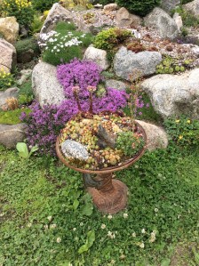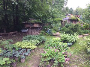 Having a yarn shop next to the artistic gardening of Lars Shick at Yonder Mountain on Main Street in Bethlehem, makes everyday in the summer both a joy and education. One day he’s putting in a new stone wall, tucking in chunks of Peach Citrine he recently acquired. The next day he’s poking little succulents into a rock garden. Then this morning, on the way to the shop, I spot curved iron rods spanning from the house to the shed, getting ready to support some climbing plants (maybe Hardy Kiwi or Honeysuckle?). Then the plants! The native Showy Lady Slipper; an unusual Chinese hydrangea, Deinanthe Caerulea; native Twisted Stalk (Varigated Streptopus); the intersectional Peony, Itoh Peony, a cross between a Tree Peony and a Herbaceous Peony. Lars is into edibles, also: he has American Chestnuts, fruit trees, Skirret (a sweet white root crop that was popular in Tudor England), Hardy Kiwis, amongst others. The rock gardens, the ponds, the chicken coop, even the old bus, make exploring his gardens a requisite when visiting Bethlehem. So if you are my customer, I’ll be asking, “Have you been next door?”