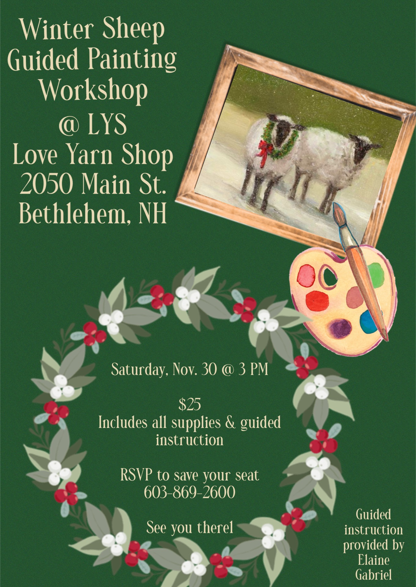 Join us on November 30th for a guided painting class with Elaine Gabriel at 3:00. $25 All materials provided.