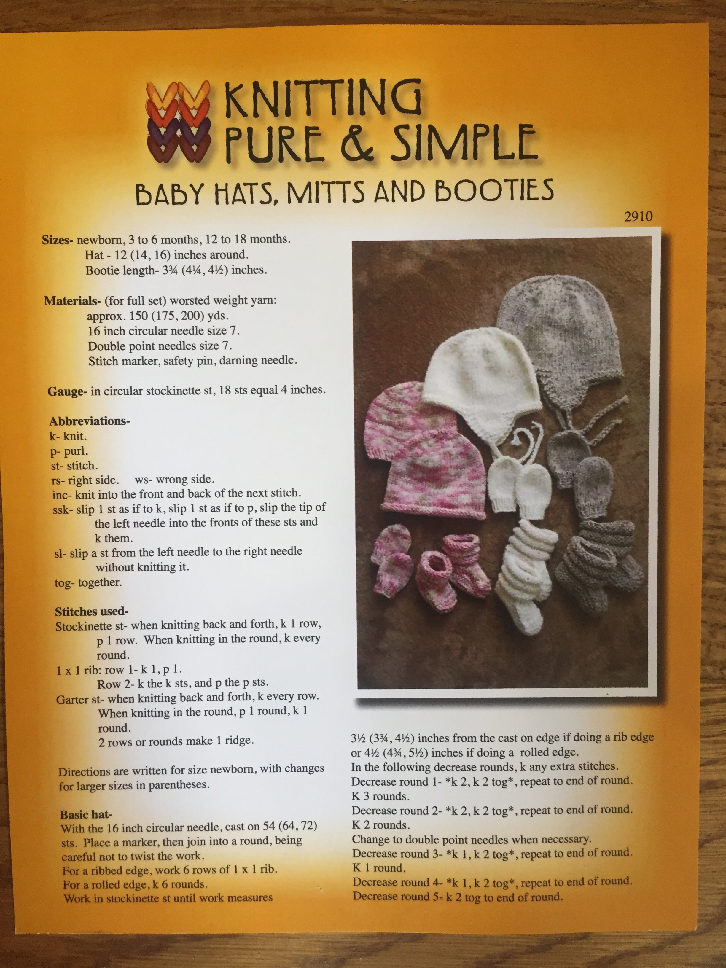 June 20th: Baby Hats, Mitts, and Booties. Worsted weight yarn. #7 16” and DP needles. Additional $5.50 for pattern.