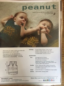June 27th: Peanut Baby Vest. Learn fair-isle carrying two colors. DK weight. #4 and #6 needles. Additional $6.50 for pattern.